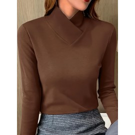 Cutout Rhinestone Mock Neck T-Shirt, Casual Long Sleeve Top For Spring & Fall, Women's Clothing