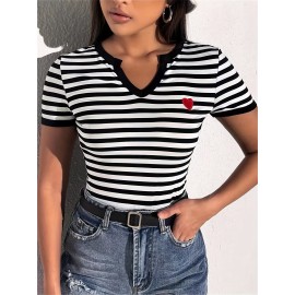 Striped Print V Neck T-Shirt, Casual Short Sleeve Ruched Top For Spring & Summer, Women's Clothing